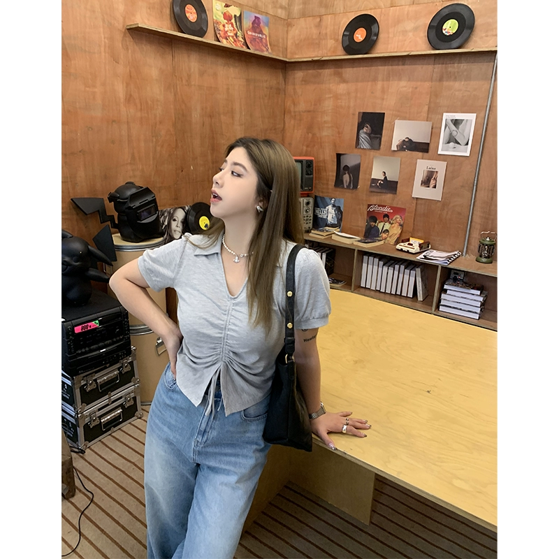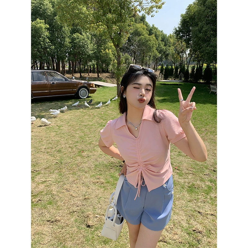 | nameOriginal | Li Xiaosha fat mm black short-sleeved T-shirt summer plus size women's v-neck waist slimming short versatile drawstring top |