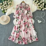 | nameOriginal | Light and mature style long-sleeved bow-tie cinched waist and slimming A-line printed chiffon dress with large hem and elegant long skirt |