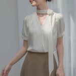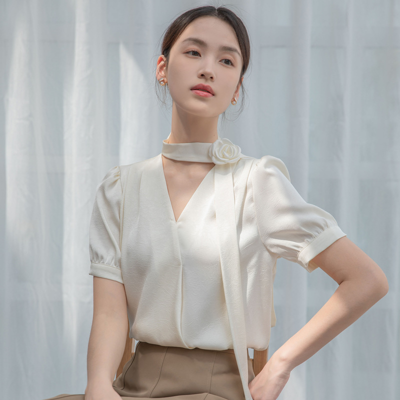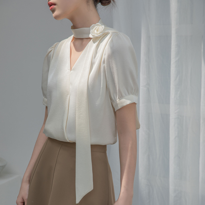 Light apricot short sleeve shirt women's summer new jacquard retro V-neck short sleeve shirt commuter professional shirt clothing wholesale