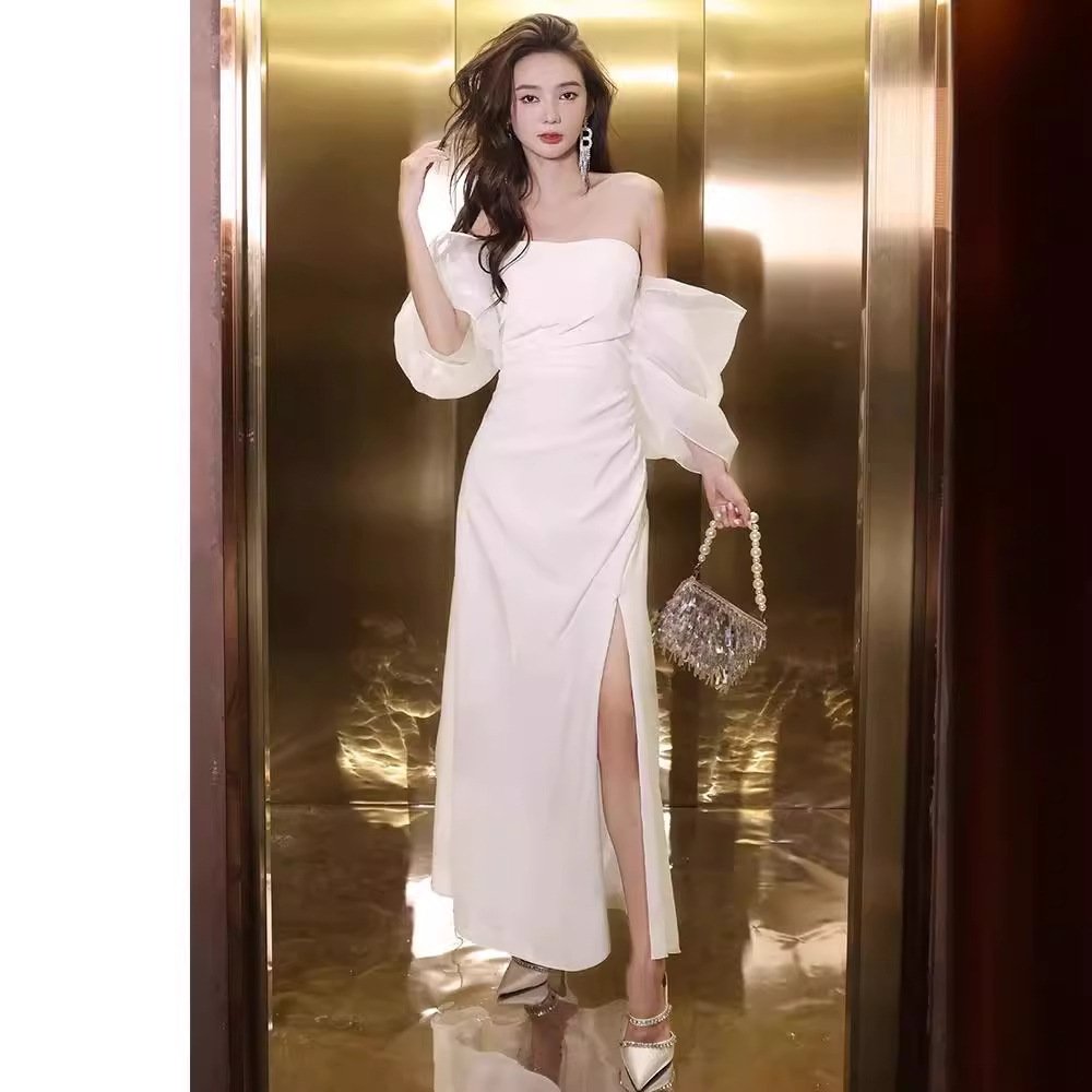 Light wedding dress women's banquet light luxury niche high-end high-end sense host off-shoulder fairy white can be worn at ordinary times