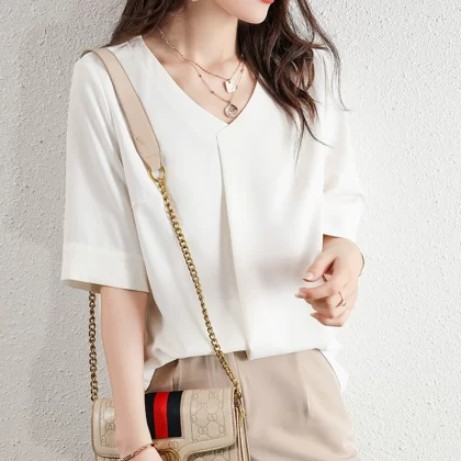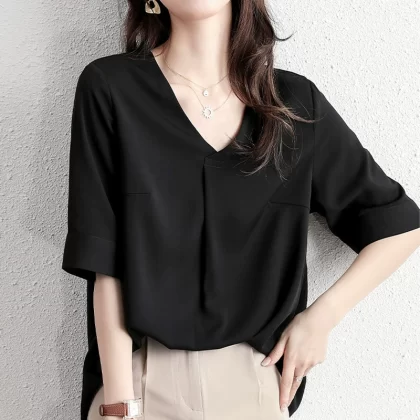 | nameOriginal | Loose belly-covering V-neck design top with short sleeves |