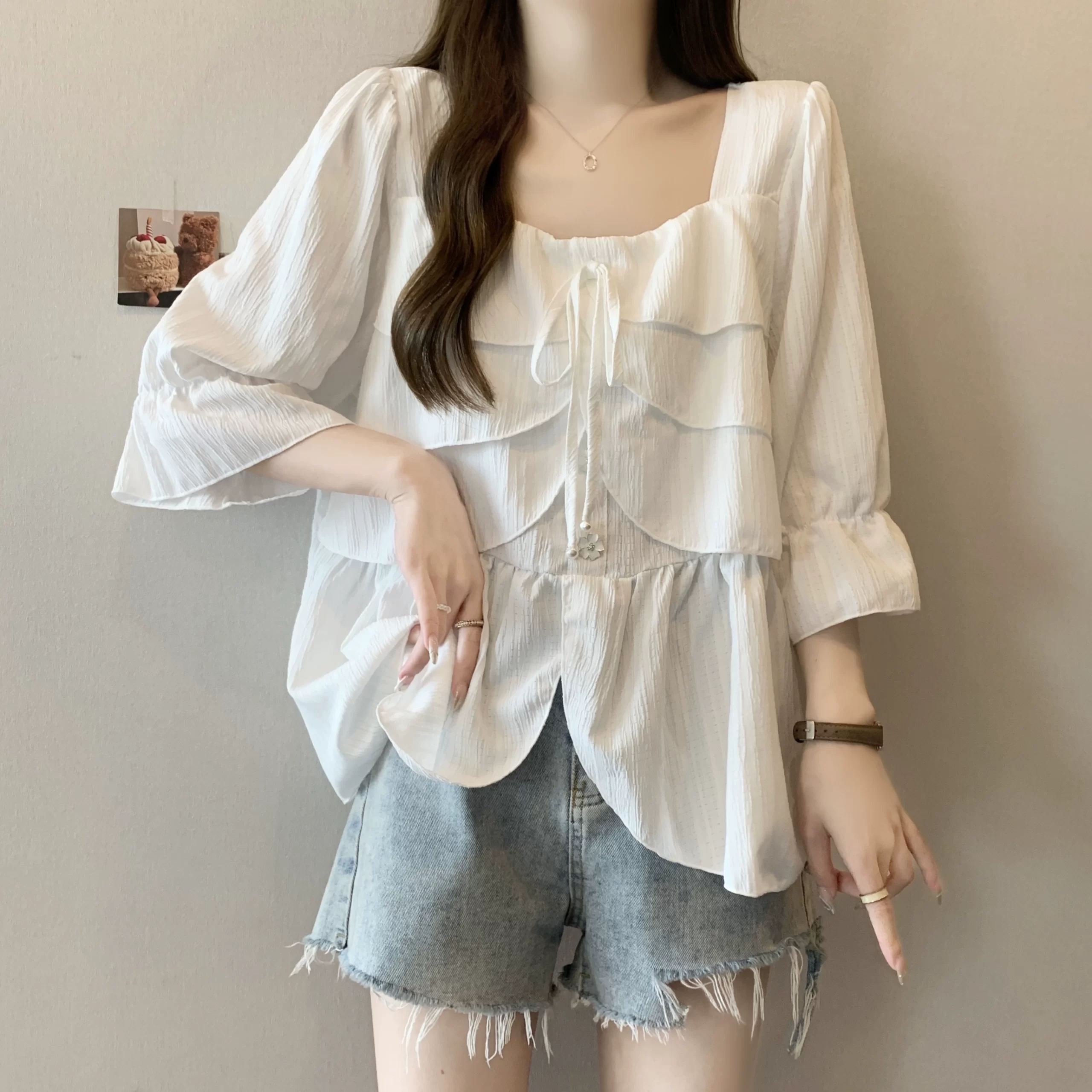 | nameOriginal | Loose, flesh-covering, ruffled chiffon short-sleeved shirt for fat girls |
