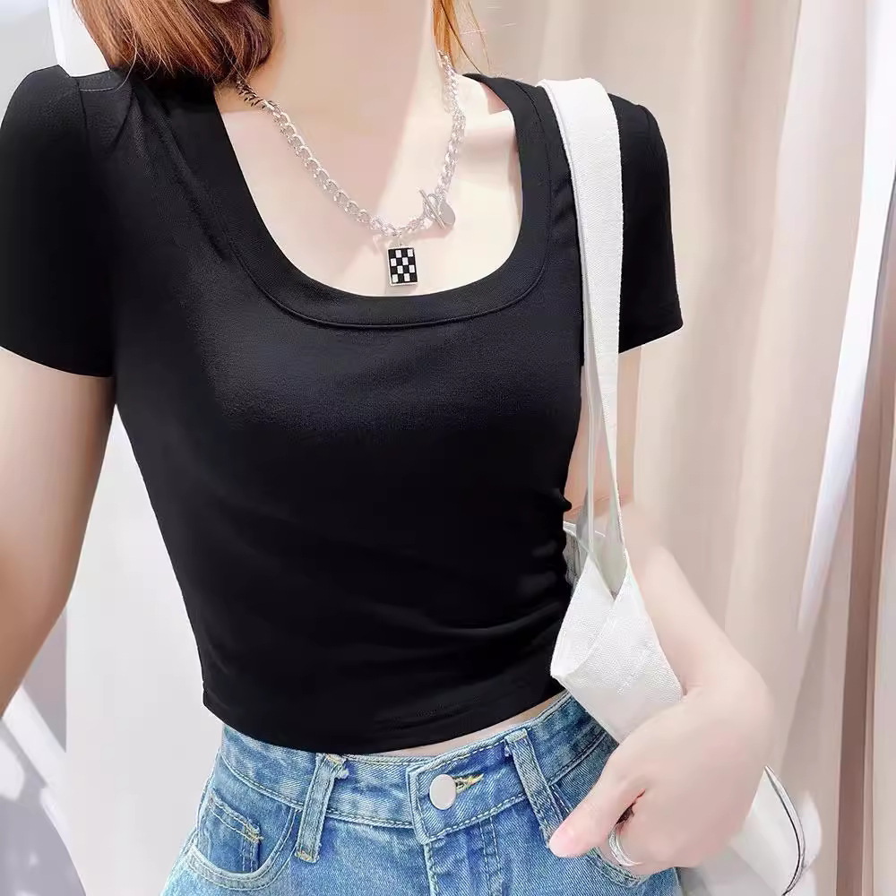 تي شيرت نسائي بياقة منخفضة وأكمام قصيرة لصيف 2024 بكتف جديد بقصة ضيقة نصف كم بسيط أساسي بلون سادة كل مباراة
