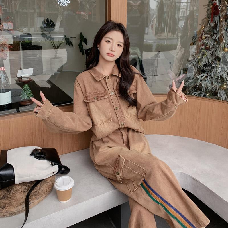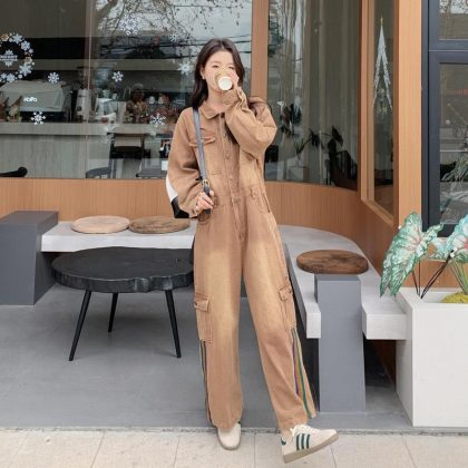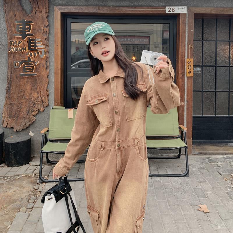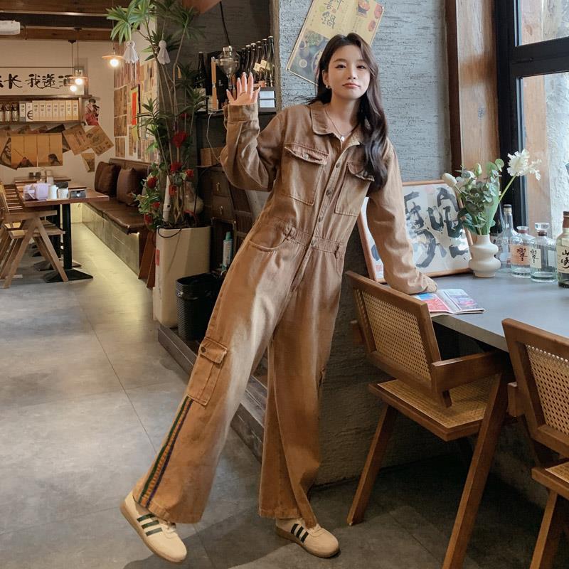 | nameOriginal | Maillard Brown Denim overalls women's 2024 spring new retro loose slimming straight wide-leg pants |