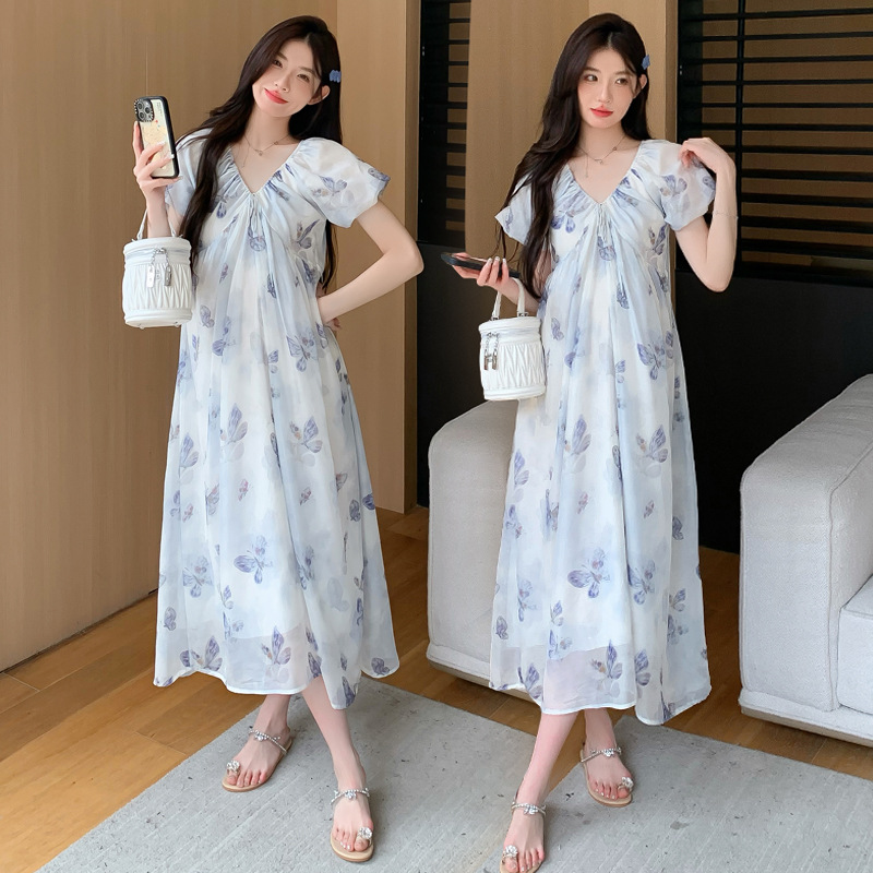Maternity Dress Real Shot 2024 New Maternity Dress plus size Chiffon Fashion Wearing Pregnant Women dress Belly Covering Foreign Style