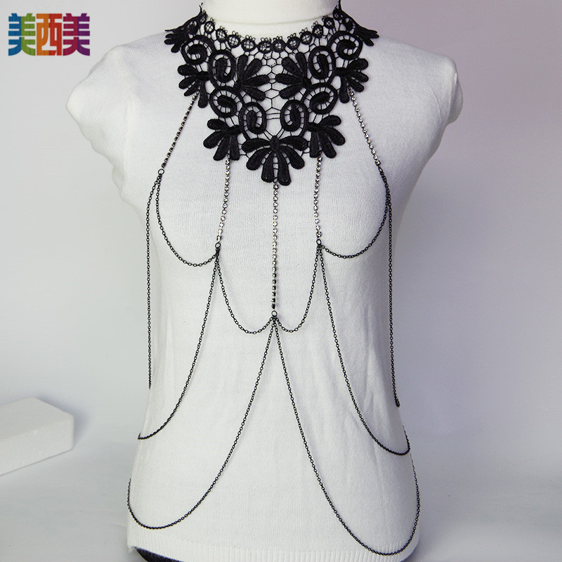 Meimei body chain jewelry black lace multi-layer diamond chain tassel necklace body chain