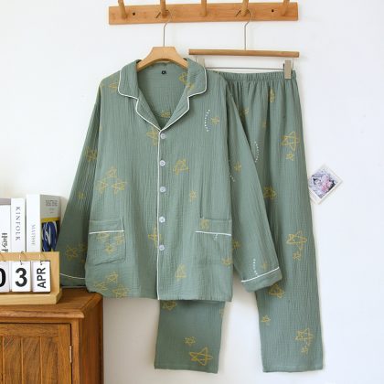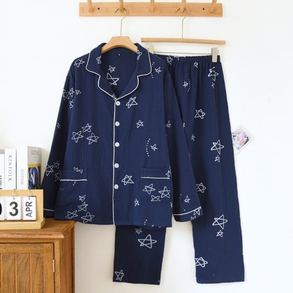 ملابس منزلية جديدة للرجال بدلة كريب للربيع والخريف نجمة خماسية بأكمام طويلة بنطلون قطن بيجامة منزلية بلونين تسمح بمرور الهواء وامتصاص العرق