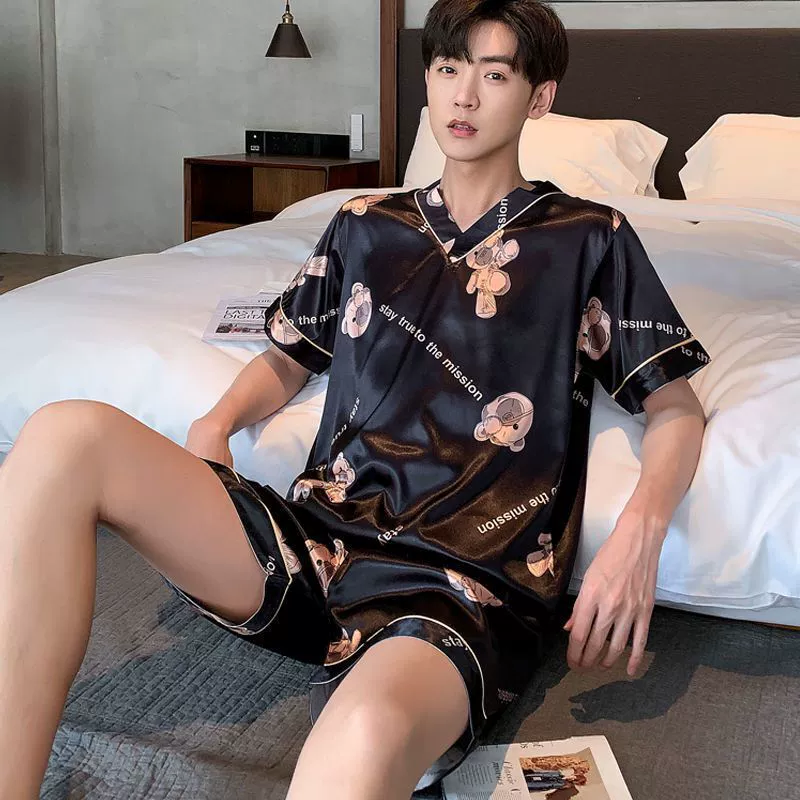 بيجامة رجالية صيفية فضفاضة مقاس كبير من الحرير المقلد بأكمام قصيرة
