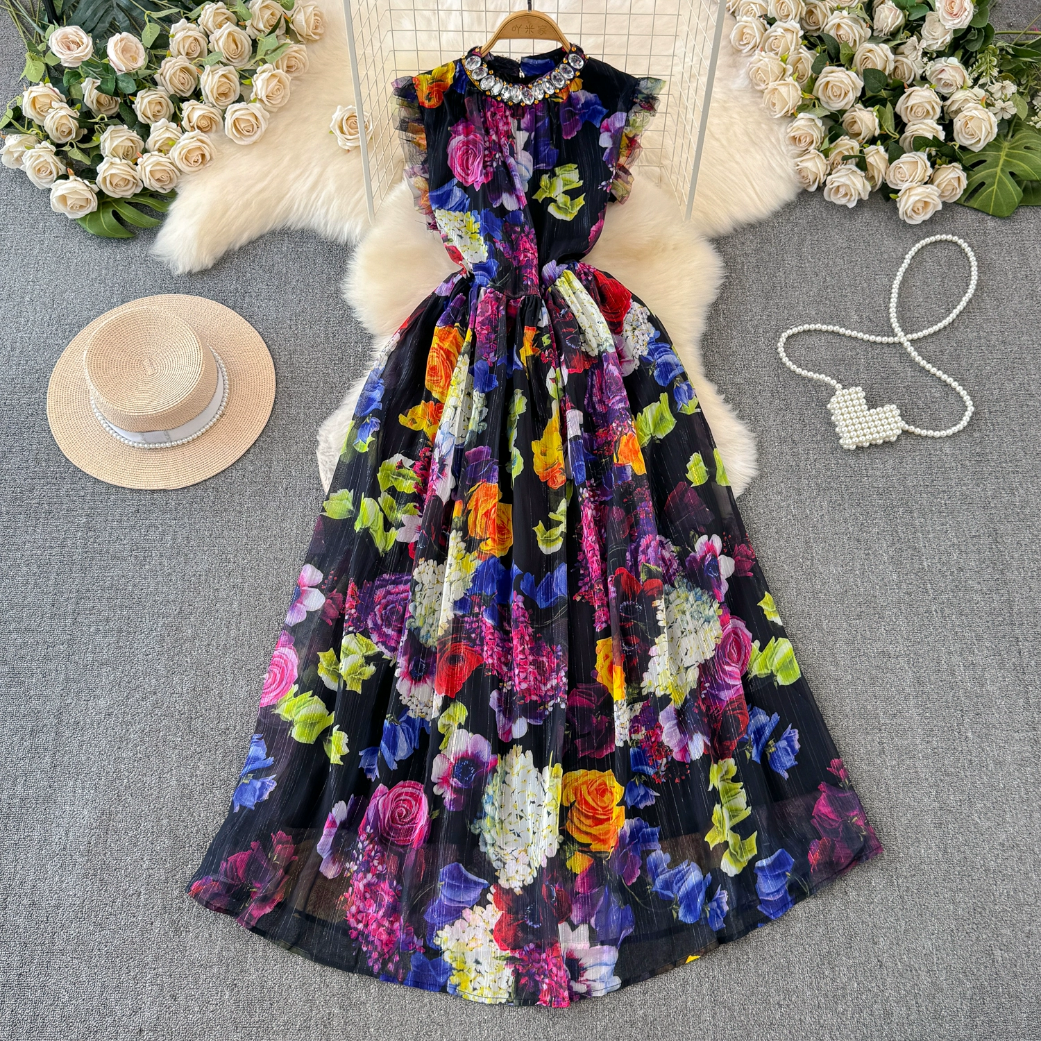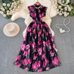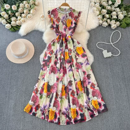 | nameOriginal | Mid-length holiday sleeveless vest dress 2024 summer women's retro rose print nail diamond high waist slim dress |