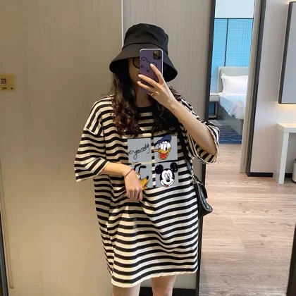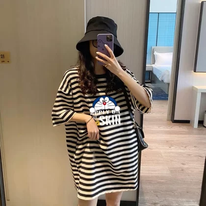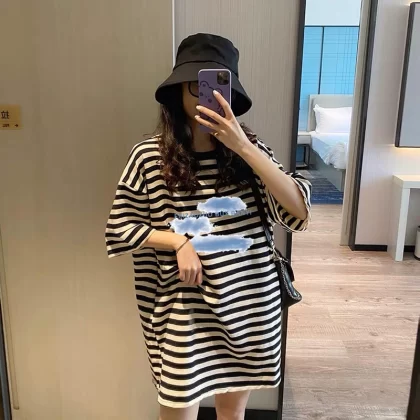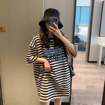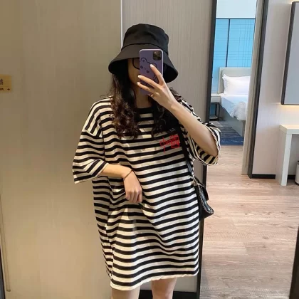 | nameOriginal | Mid-length pure cotton striped loose student short-sleeved T-shirt |