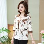 nameOriginal | Middle-aged Mother's Floral Chiffon Shirt Women's Summer Dress Seven-sleeve Belly Covering Age-reducing Top Pullover V-neck Shirt |
