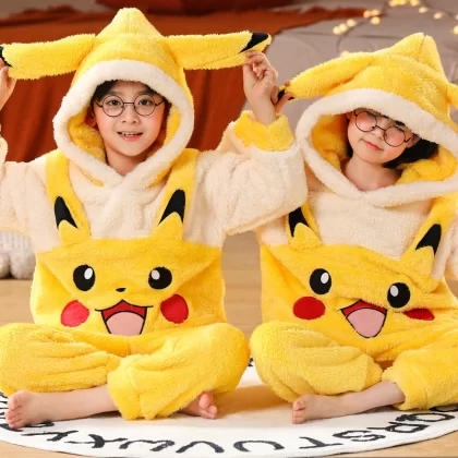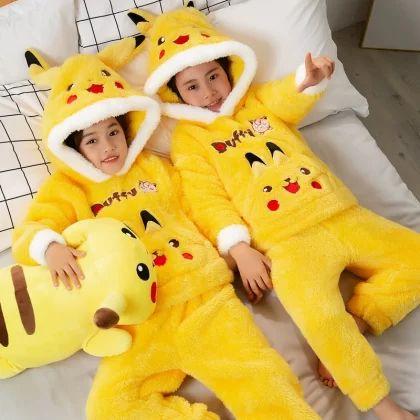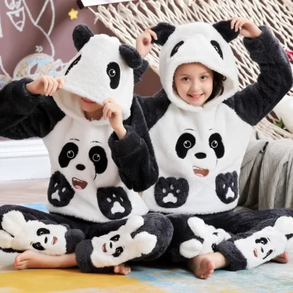 بيجامات أطفال متوسطة وكبيرة للخريف والشتاء طقم ملابس منزلية مخملية سميكة كرتونية لطيفة من المخمل المرجاني للأطفال الأولاد والبنات
