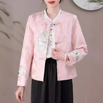 أمي الجديدة النمط الصيني النمط الوطني معطف أنيق 2024 الربيع الرجعية معطف قصير مشبك الجاكار كم طويل الأعلى للنساء