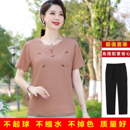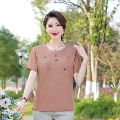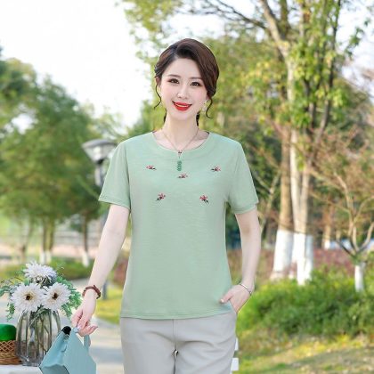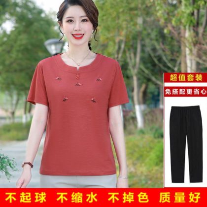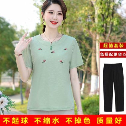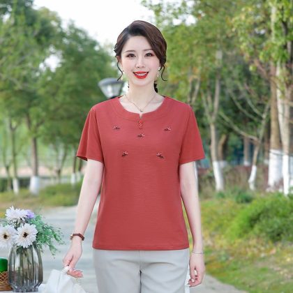 Mother's Clothing Summer Western Style Fashion Round Neck Shirt Middle-aged and Elderly plus size Women's Short-sleeved Slim-fit Thin Top
