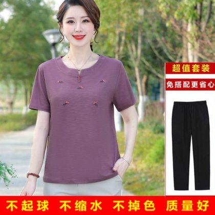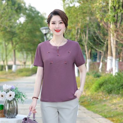 ملابس الأم الصيف النمط الغربي قميص الرقبة المستديرة في منتصف العمر وكبار السن بالإضافة إلى حجم المرأة قصيرة الأكمام سليم صالح رقيقة