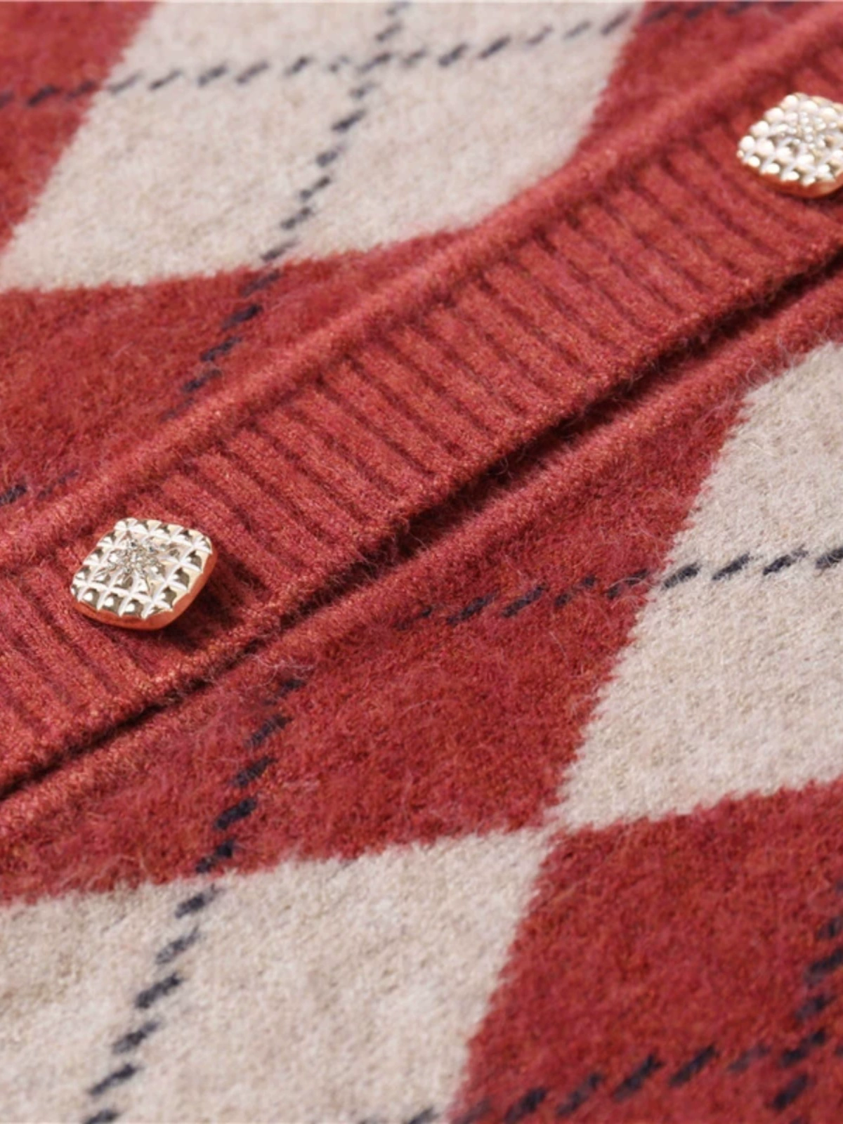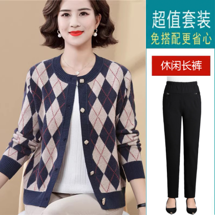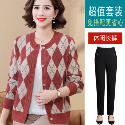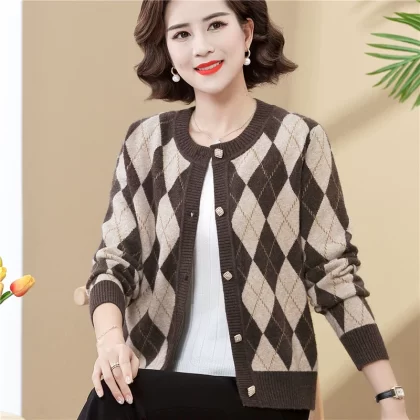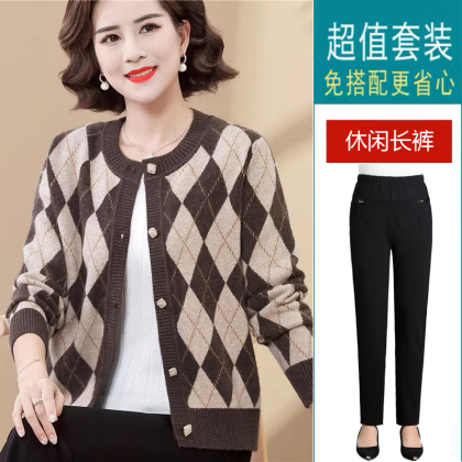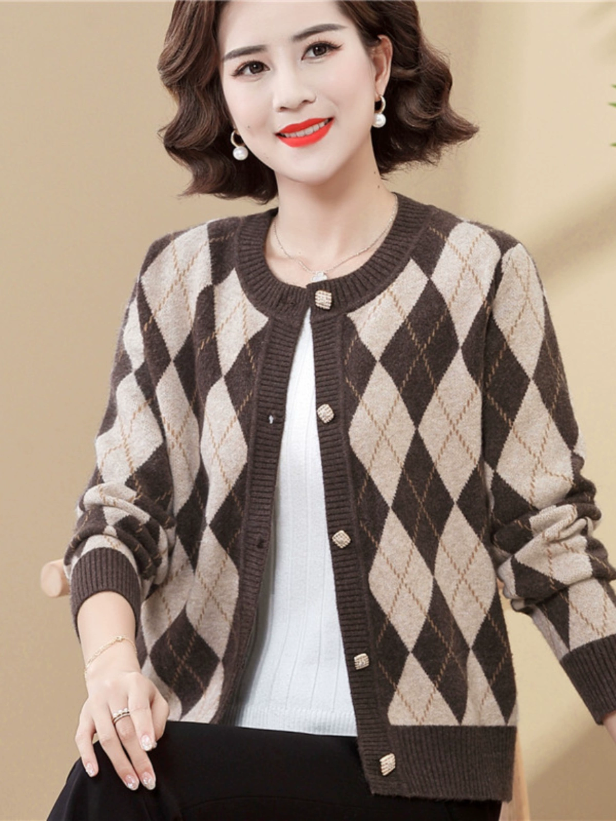 Mother's spring and autumn fashion thin plaid coat middle-aged women's short jacket top clothes middle-aged and elderly knitted cardigan
