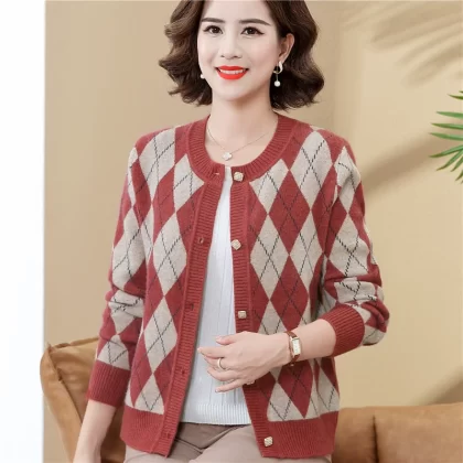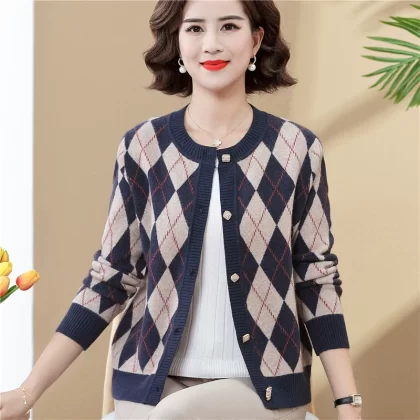 أزياء الربيع والخريف الأم ، سترة منقوشة رقيقة ، سترة قصيرة للسيدات في منتصف العمر ، كارديجان في منتصف العمر وكبار السن.