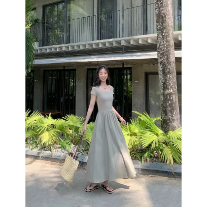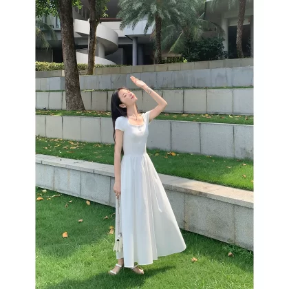 MULVAN white square neck short-sleeved dress for women, high-end, waist-slimming, slimming A-line knitted splicing long skirt