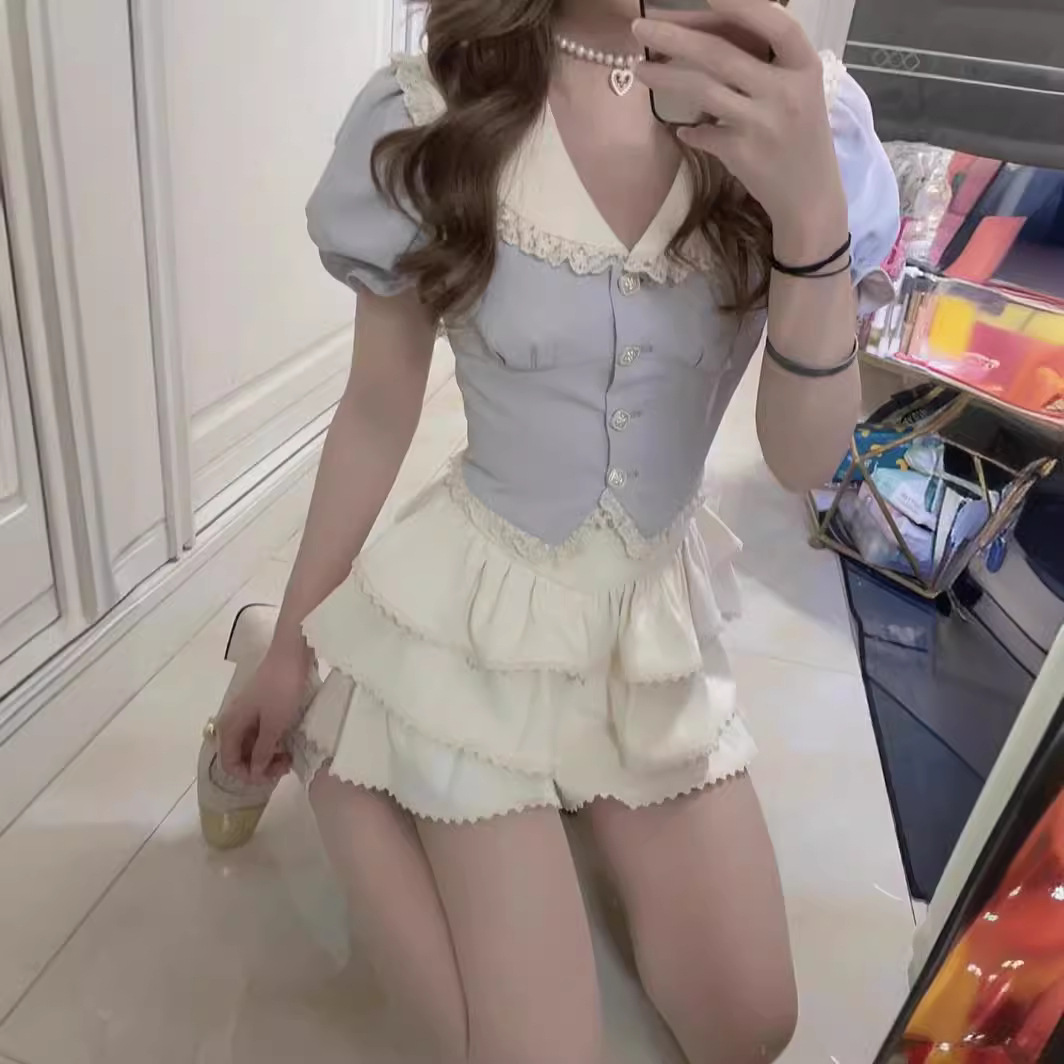 Navy Collar Academy Style Dress Women's Summer New Spice Girls Short-sleeved Top High Waist Cake Skirt Two-piece Set