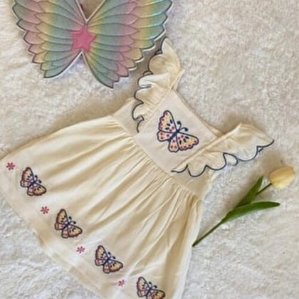 Necix s dress Butterfly pattern detailed Muslin fabric Cream color with ruffle sleeve detail Flat collar Baby dress in different sizes Necix s dress Butterfly pattern detail Cream color with Muslin fabric Cream color Ruffle sleeve detail Flat neckline Baby dress in different sizes…