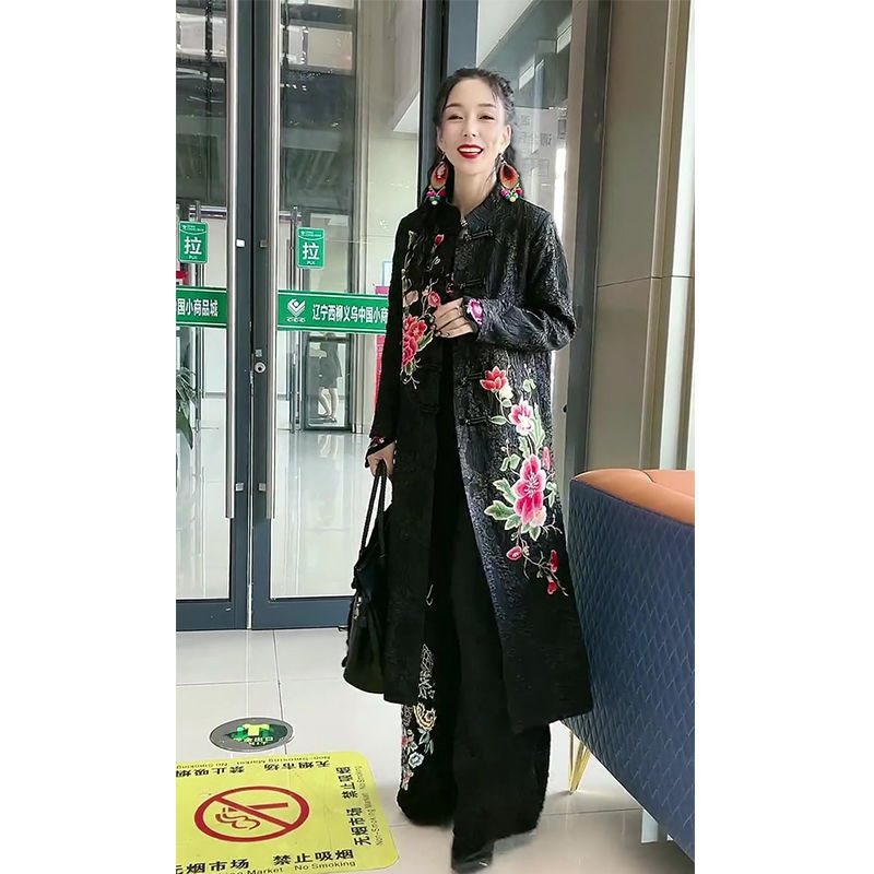 New 2022 Spring Printed Slim-fit suit Women's Ethnic Style Wide Wife Long-sleeved Age-reducing Jacket Wide-leg Pants Two-piece Set
