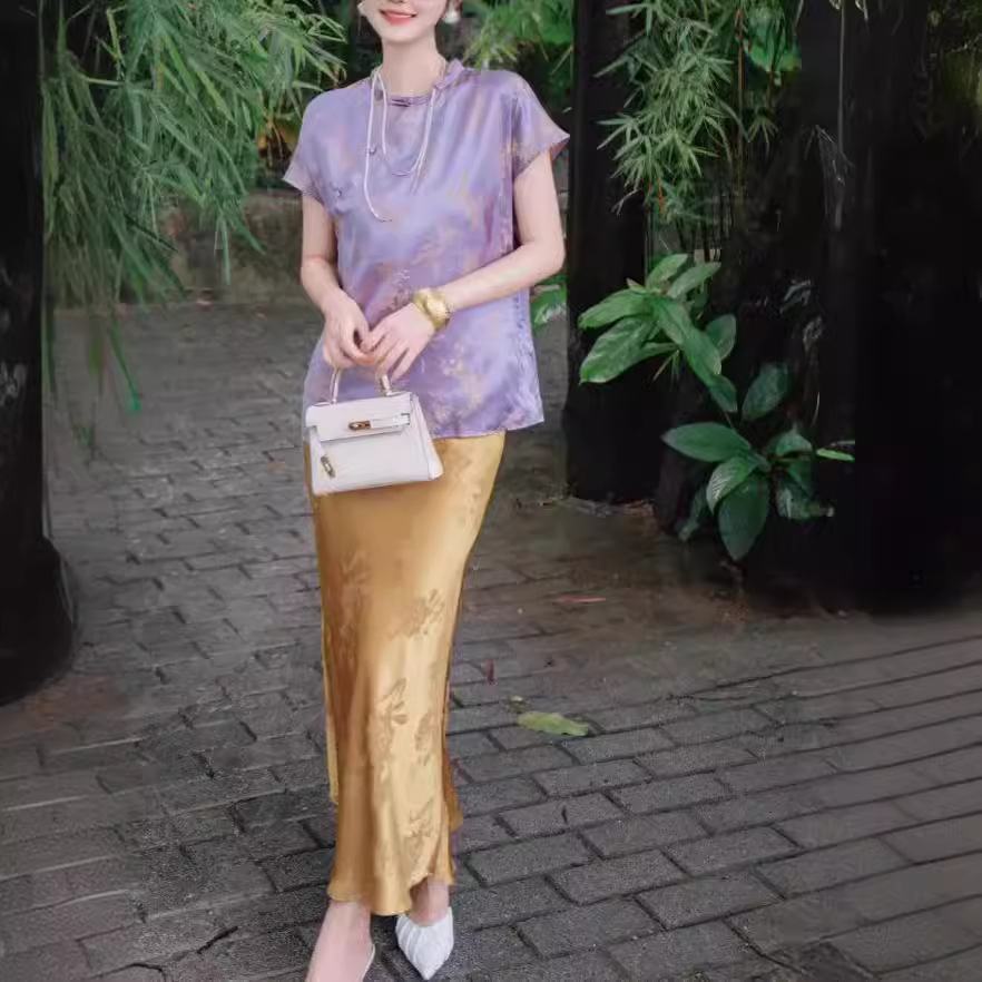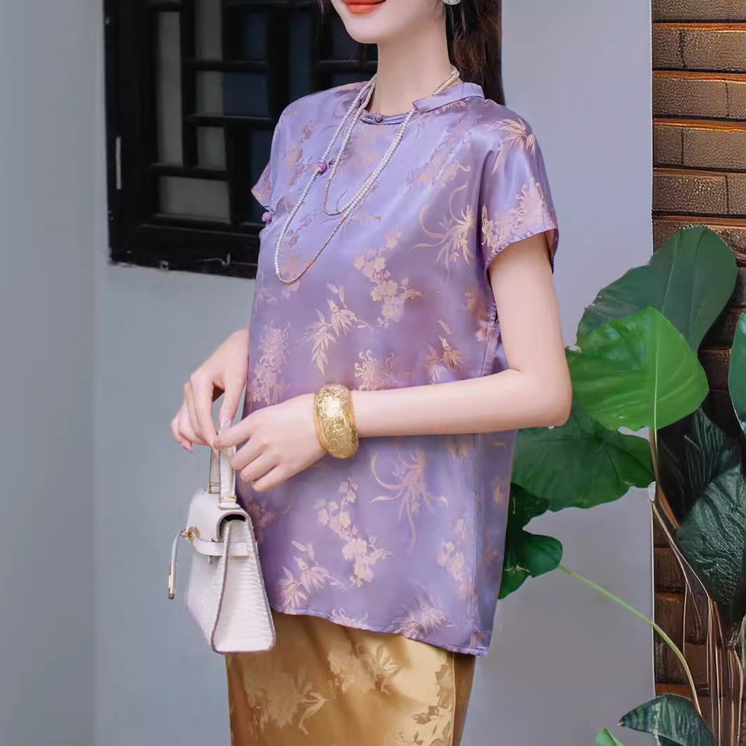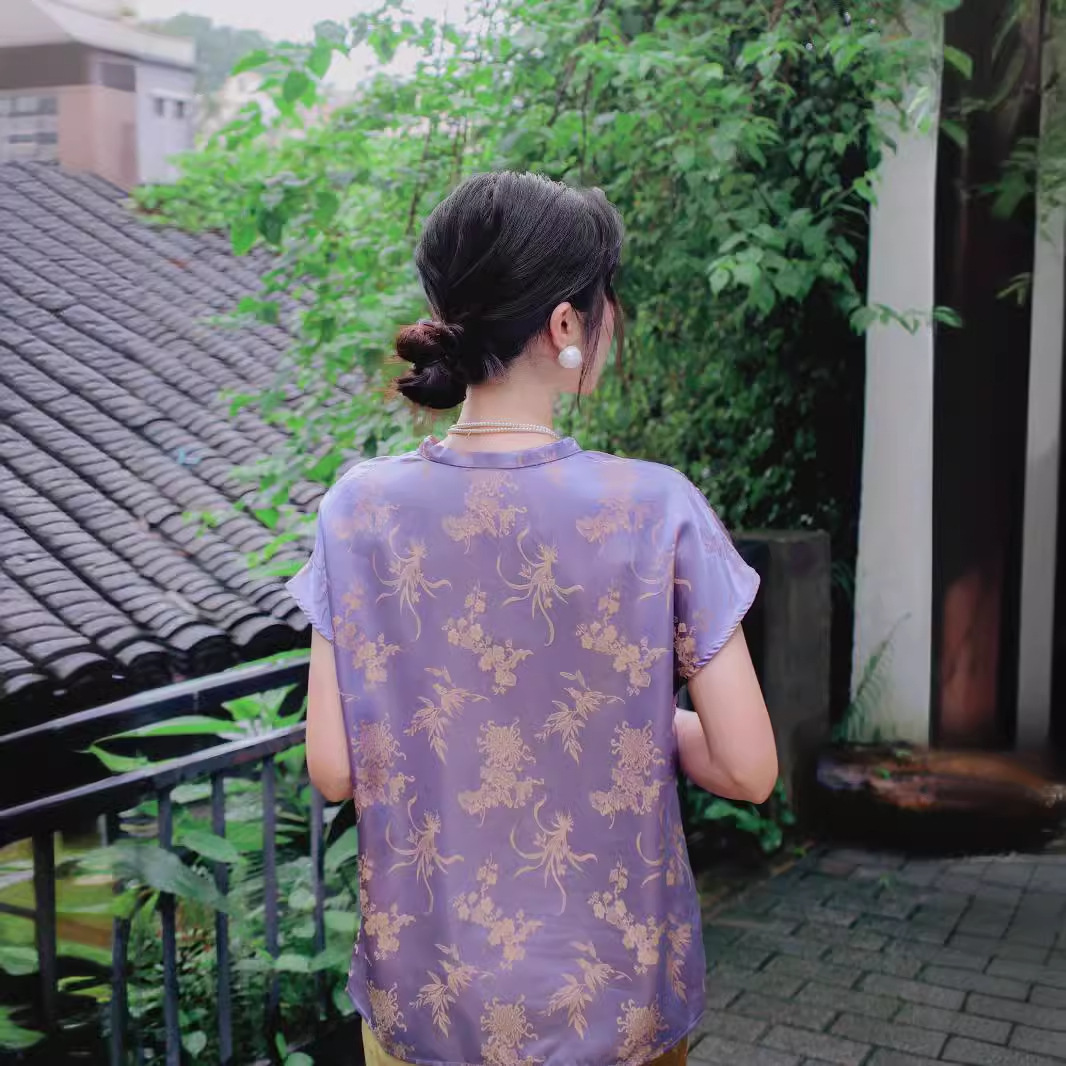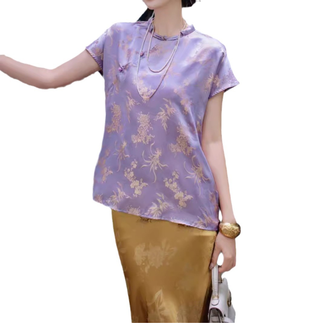 New Chinese Silk Purple Flower National Style Small Vertical Collar Buckle Single-breasted Elegant Summer Short-sleeved Tang Top