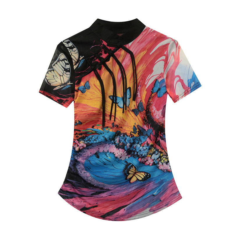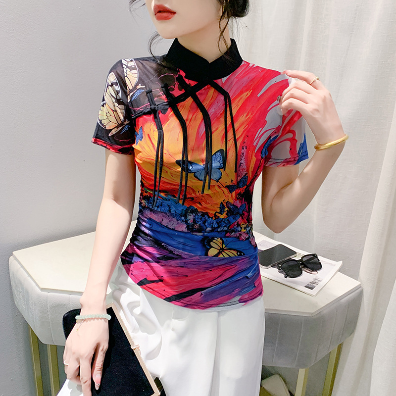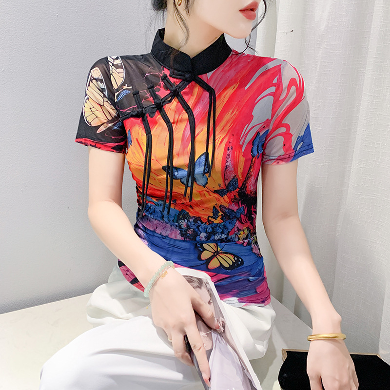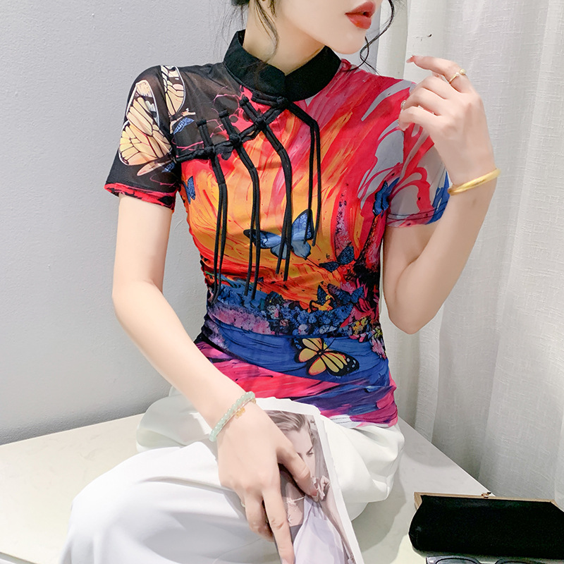 | nameOriginal | New Chinese-style Chinese-style Button-up Collar Short-sleeved Printed T-shirt Women's Summer Fashionable Slim-fit Slimming All-match Mesh Top |
