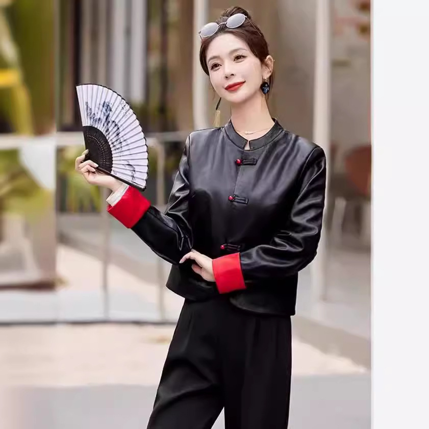 جديد النمط الصيني معطف جلد النمط الصيني مع مشبك للنساء موضة قصيرة 2024 الربيع والخريف ملابس نسائية جديدة تانغ