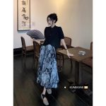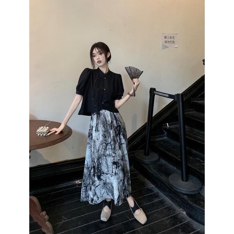 New Chinese Style Elegant National Style Niche suit Short-sleeved Shirt Women's Summer Ink Half-length Skirt Design Two-piece Set