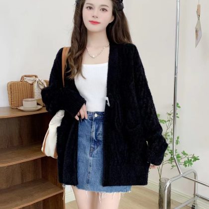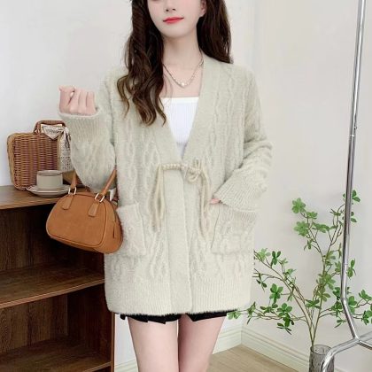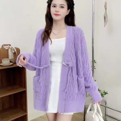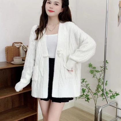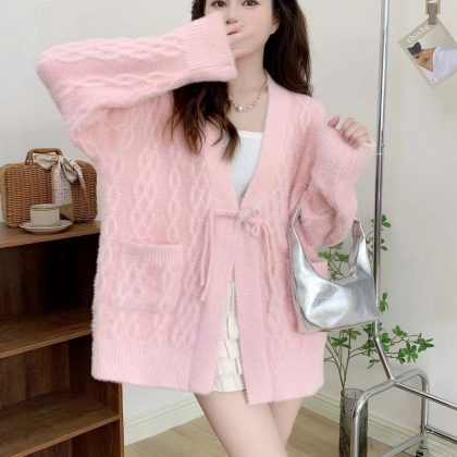 New Chinese-style Mink Fleece Knit Sweater Women's V-neck Corner Buckle Twisting Thread Loose Guofeng Sweater Jacket