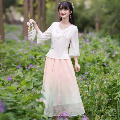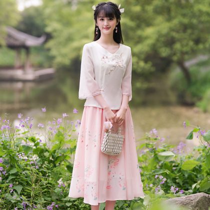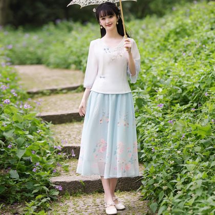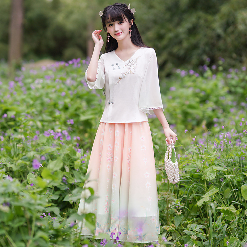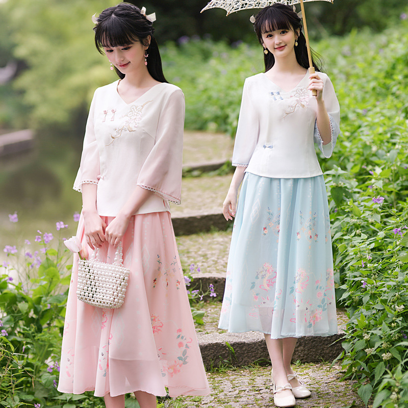 New Chinese Style National Style Embroidered V-Neck Improved Han Element Cropped Sleeve Top Chiffon Printed Large Swing Dress Set Lady