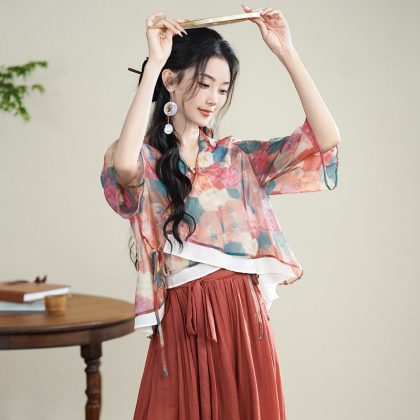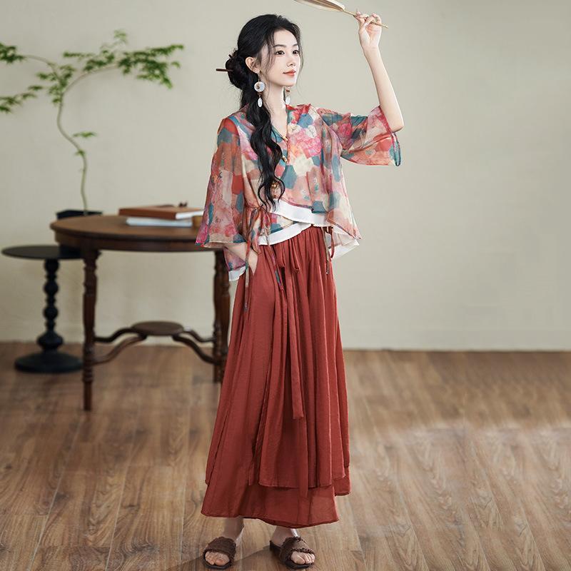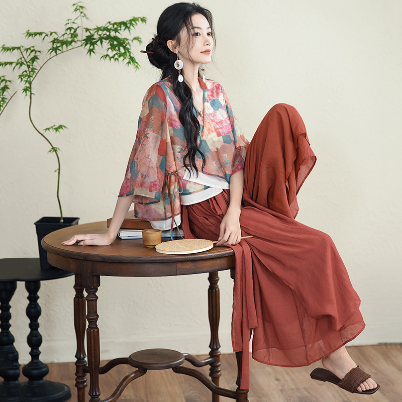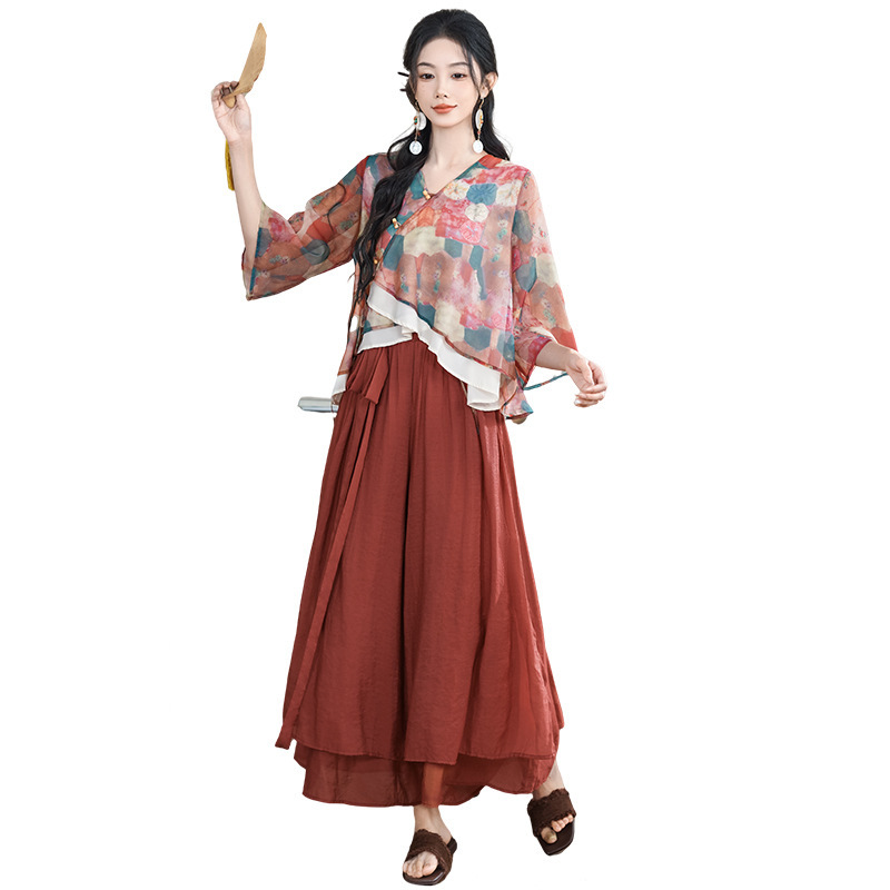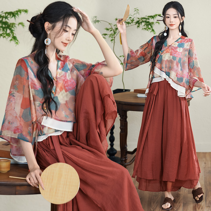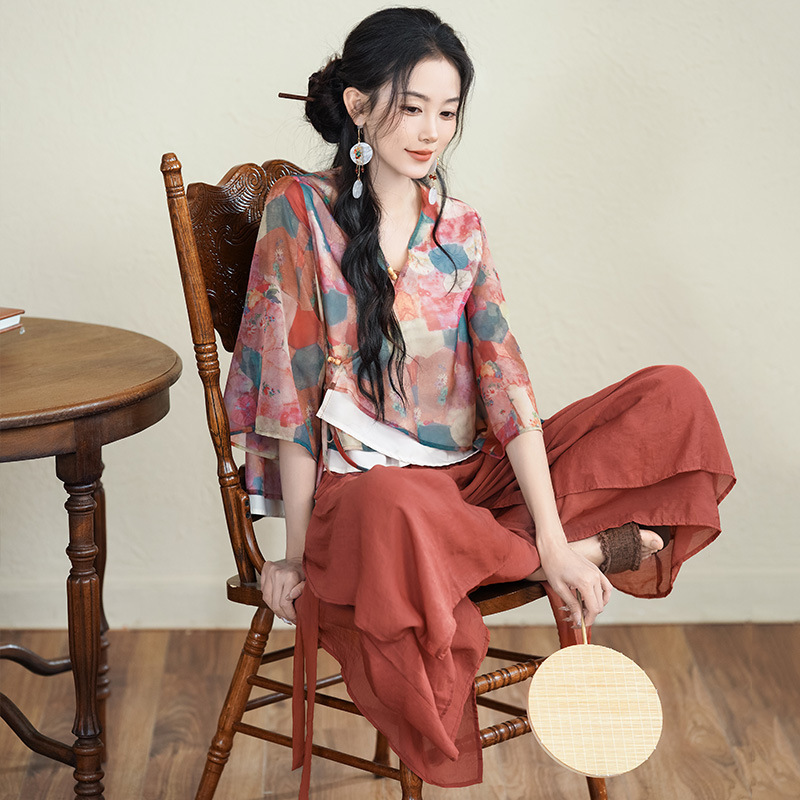 | nameOriginal | New Chinese Style National Style Retro Two-piece Set Women's Summer 2024 Modified V-neck Slant Placket Button Color Top Culottes Artistic |