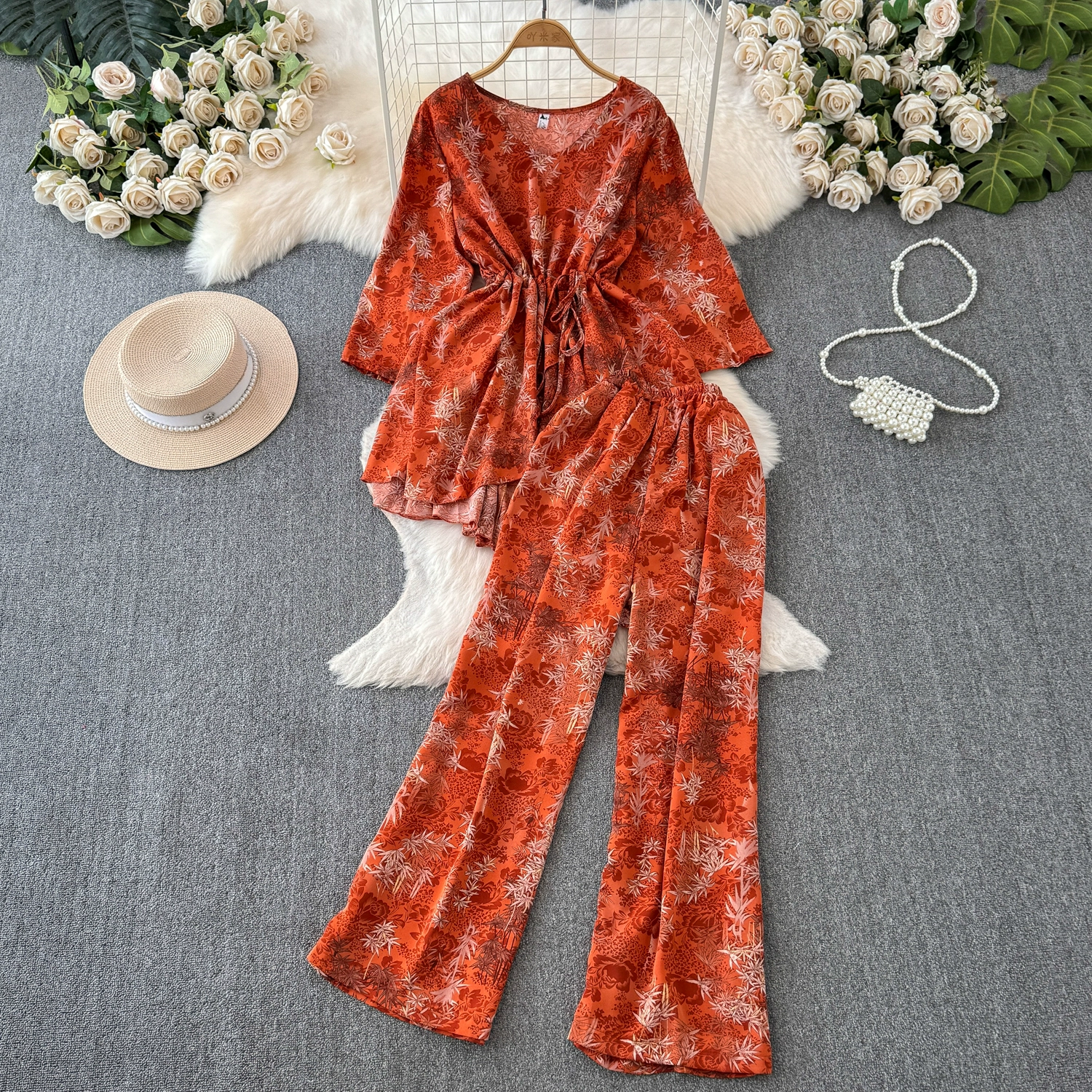 مجموعة صينية جديدة على الطراز الصيني الإناث الصيف عالية المستوى طباعة سبعة -نقطة الأكمام أعلى+الخصر العالي عريض عريض -سروال اثنين