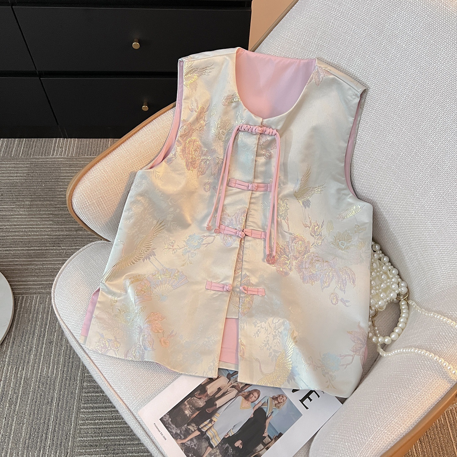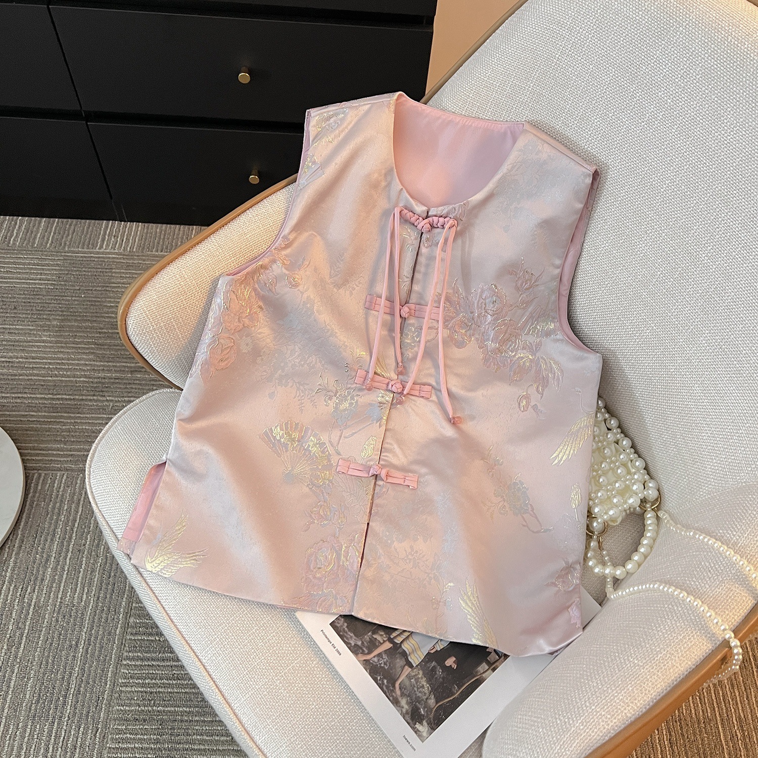 | nameOriginal | New Chinese style nostalgic jacquard buckle vest for women 2024 early spring new European Zen satin embroidered top |