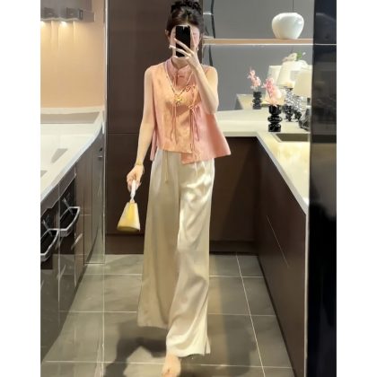 | nameOriginal | New Chinese Style Retro National Style suit Women's Summer New Elegant Two-piece Set with Buckle and Vertical Collar Vest Top Wide Leg Pants |