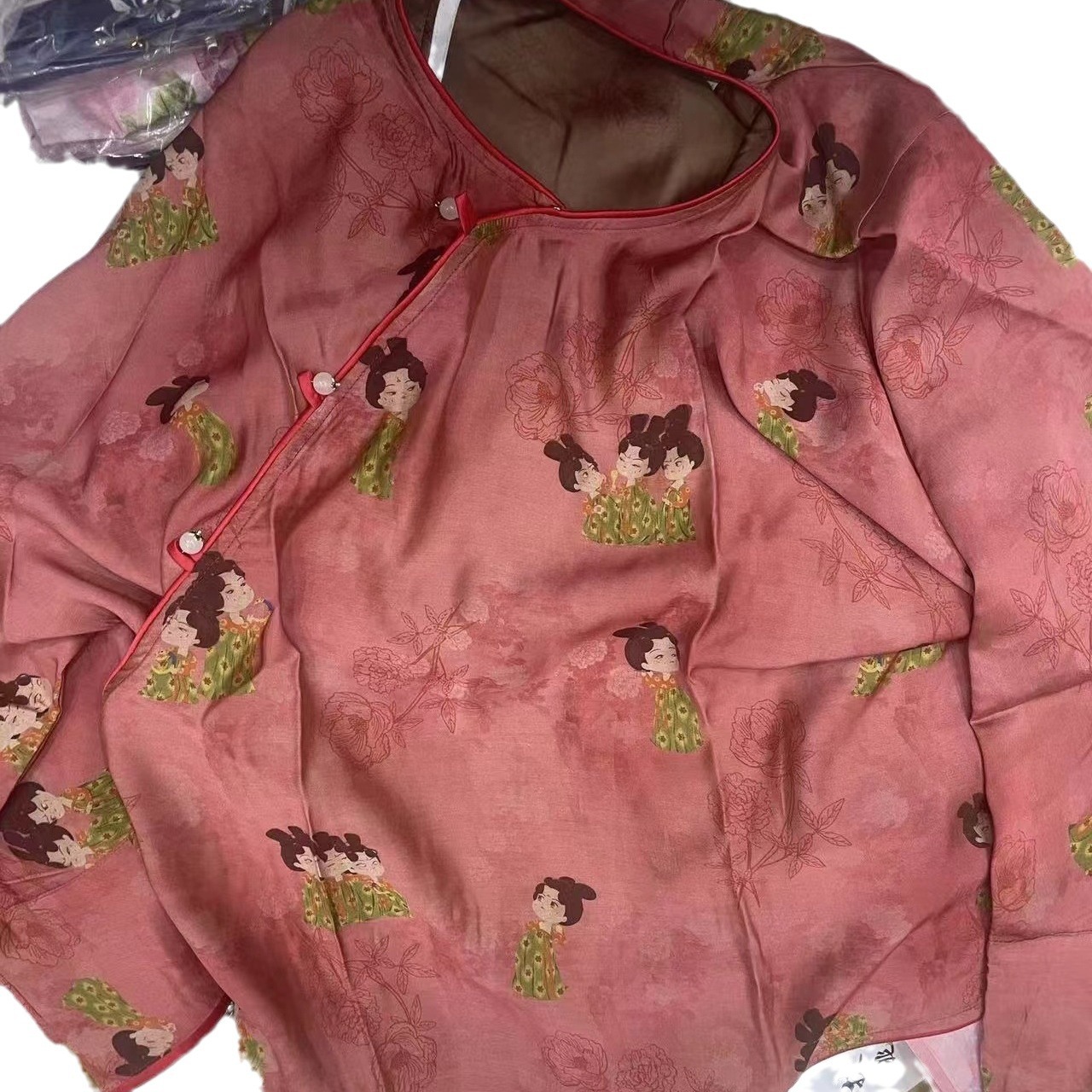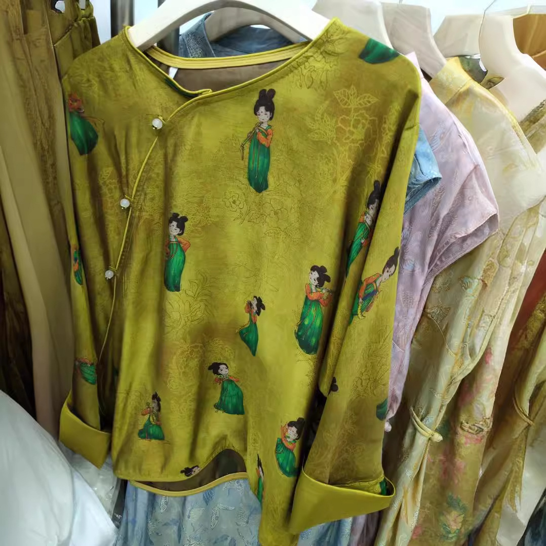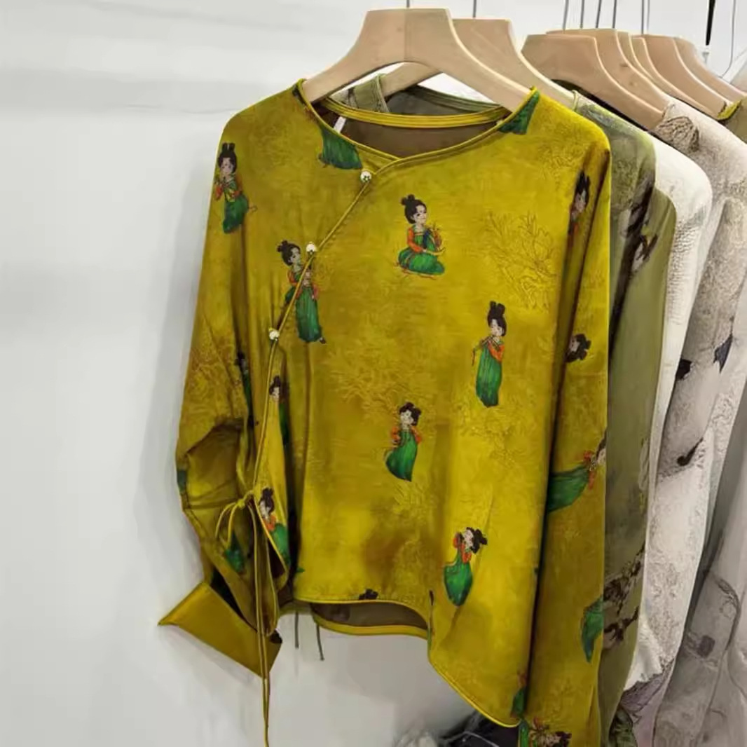 New Chinese-style Satin Acetate Printed Shirt Women's Laid-back National Style Improved Slant-breasted Round Neck Silk Top Loose Small Shirt