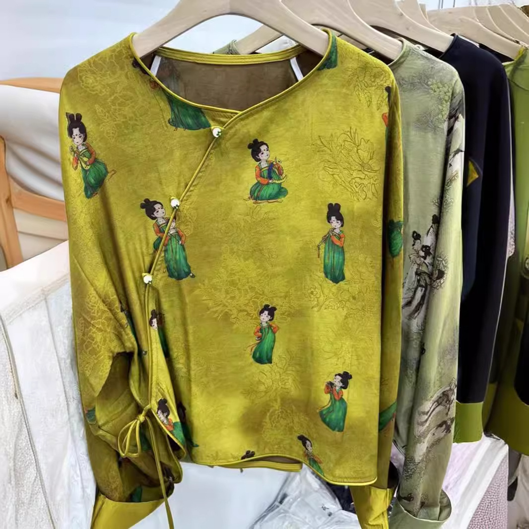 جديد النمط الصيني الساتان خلات قميص مطبوع المرأة مسترخي النمط الوطني تحسين مائل الصدر الجولة الرقبة الحرير قميص فضفاض صغير