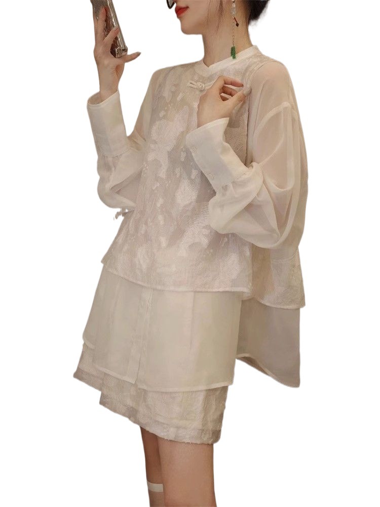 بدلة جديدة على الطراز الصيني على الطراز الوطني خفيفة فاخرة راقية الإحساس أنيقة ملابس نسائية زر أبيض قميص شورت بدلة من قطعتين
