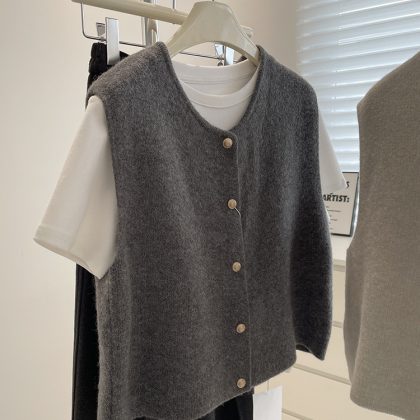 New Korean Style Elegant Gold Button Knitted Vest Autumn and Winter Gentle Soft Waxy Outer Sweater Vest Solid Color Stacked Top