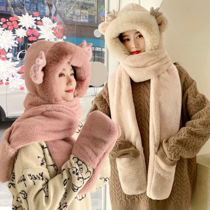 | nameOriginal | New Long Horn Hat Women's Winter Scarf Gloves One Cute Cute Warm Three-in-One Thickened Plush Three-Piece Set |