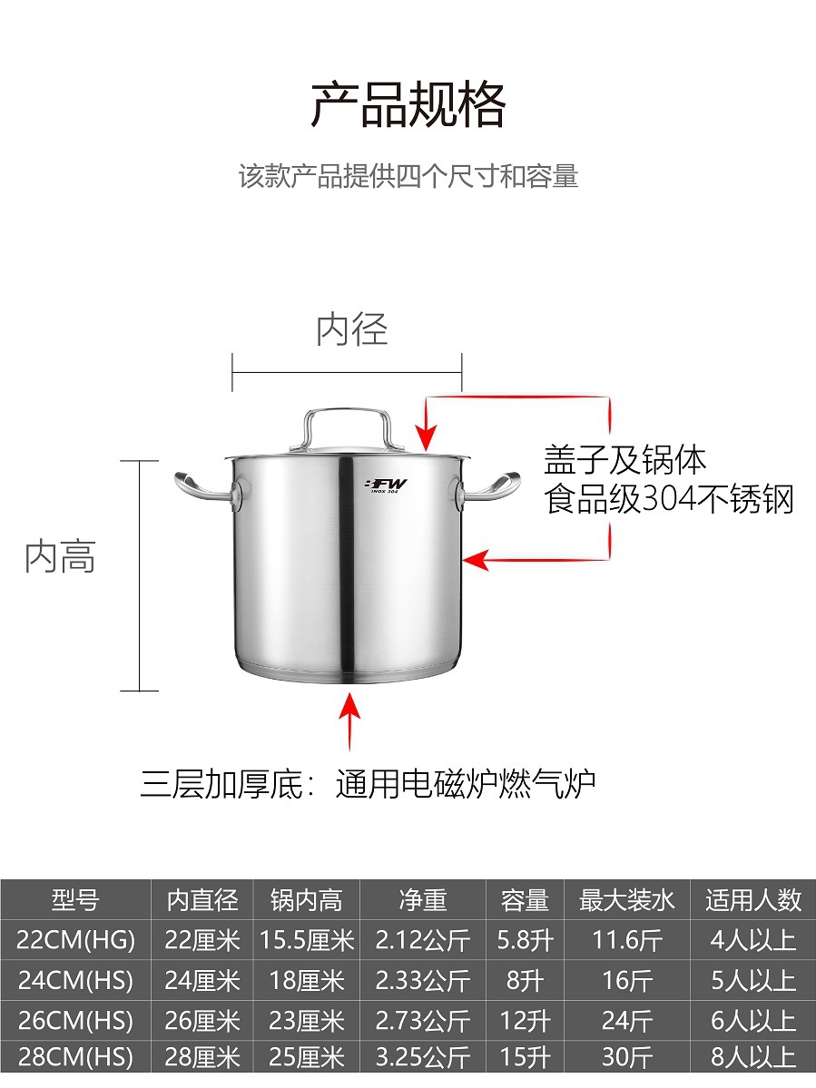 NN0I household large soup pot soup pot soup bucket rice bucket rice pot thickened 304 stainless steel 22/24/26/28CM