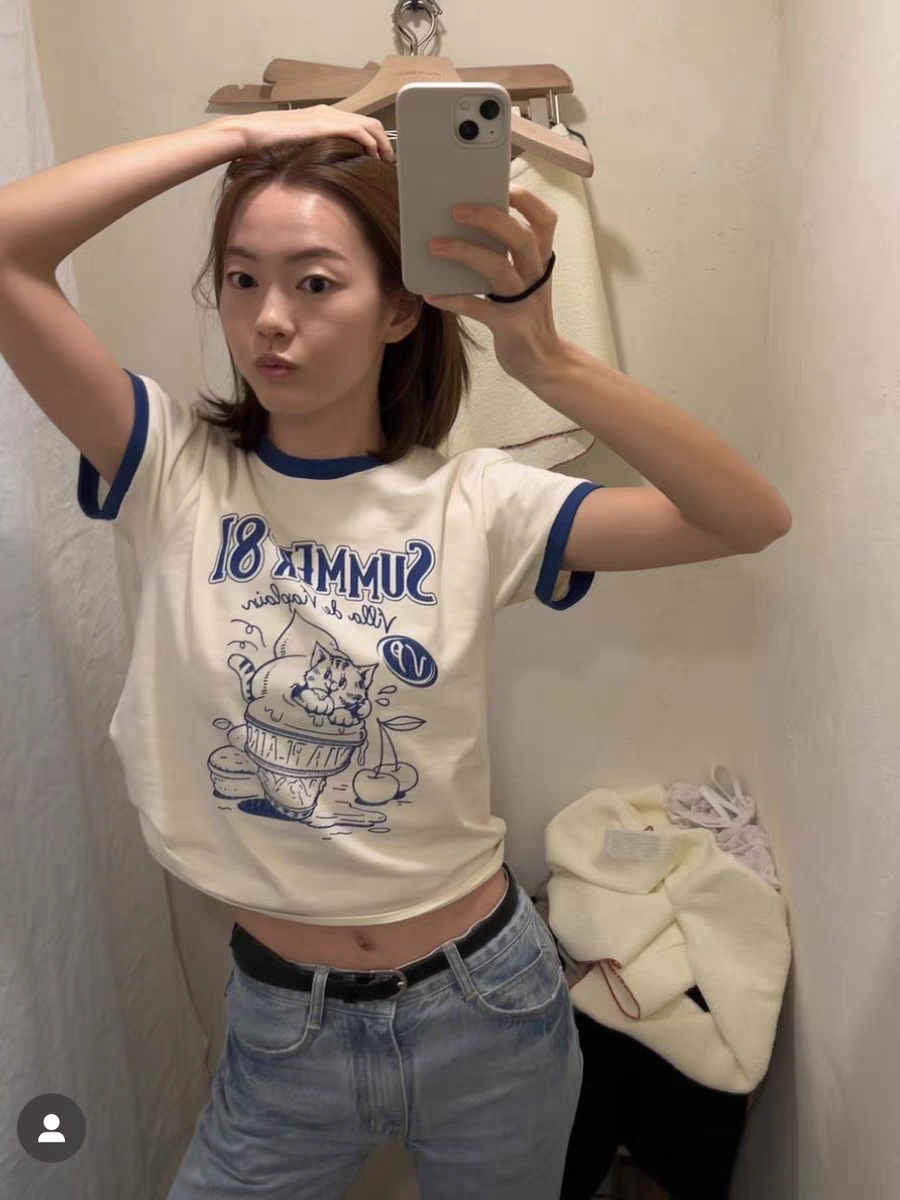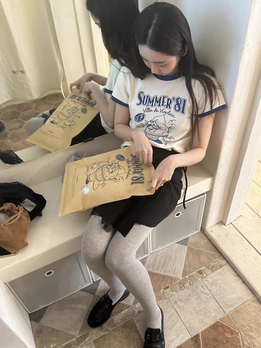 Now H2024 spring new South Korea east gate vi * plain loose crew neck kitten pattern printed short sleeve T-shirt