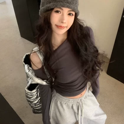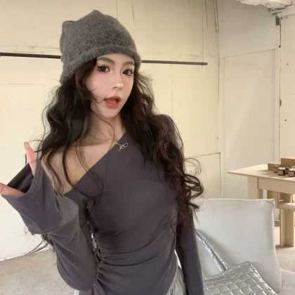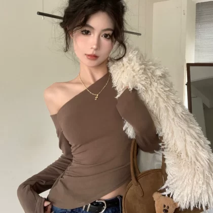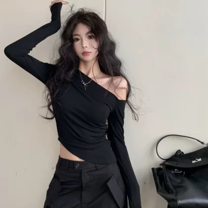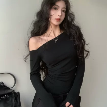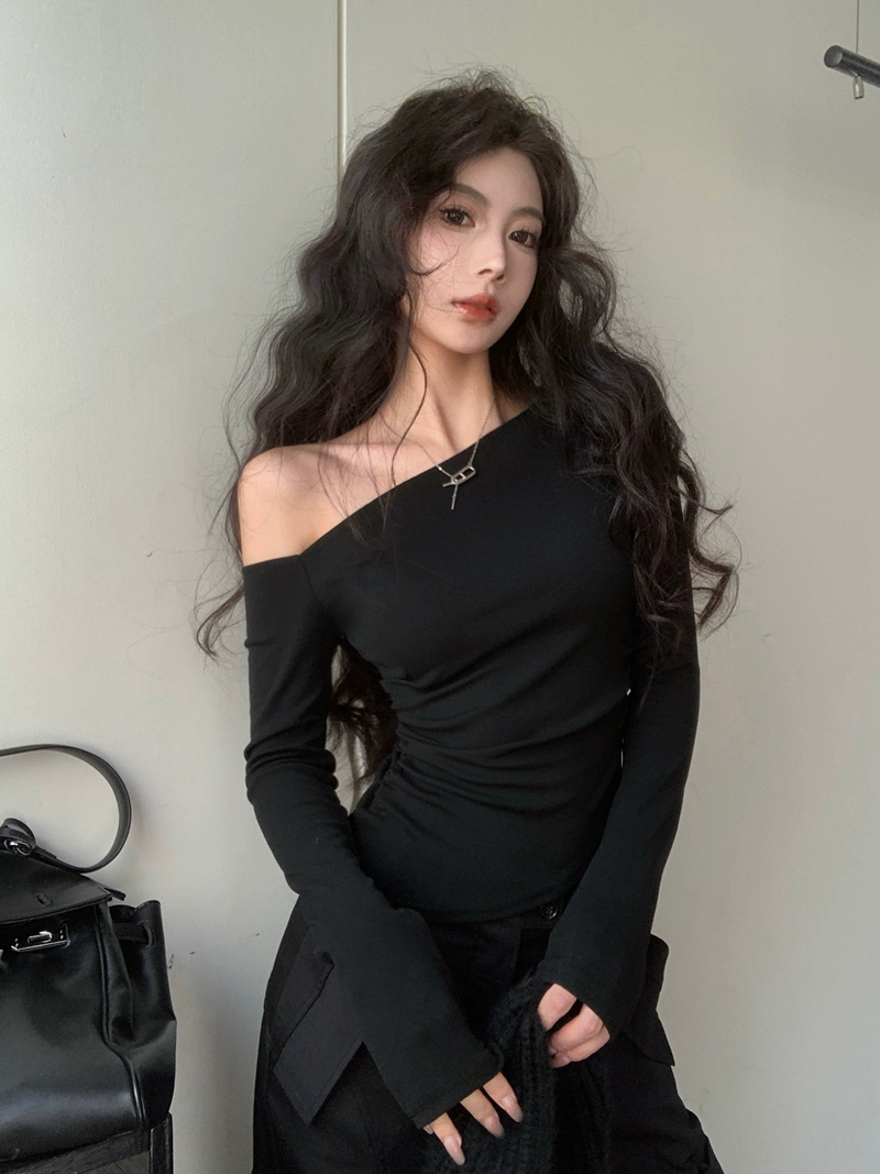 | nameOriginal | Off-shoulder black spring irregular slim long-sleeved T-shirt |