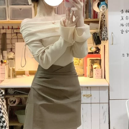 Off-shoulder long-sleeved bateau neck sweater suit skirt top