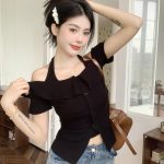 Off-shoulder T-shirt summer waist-cinching top for fat girls short sleeves