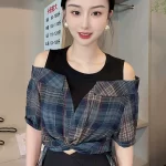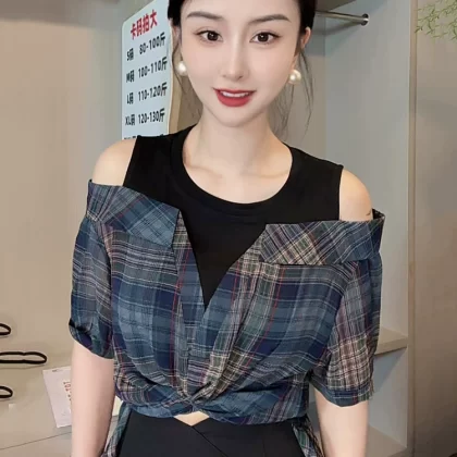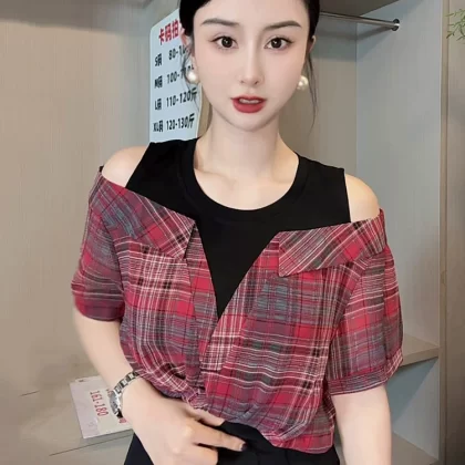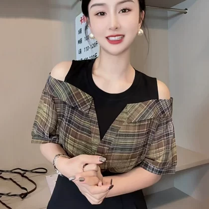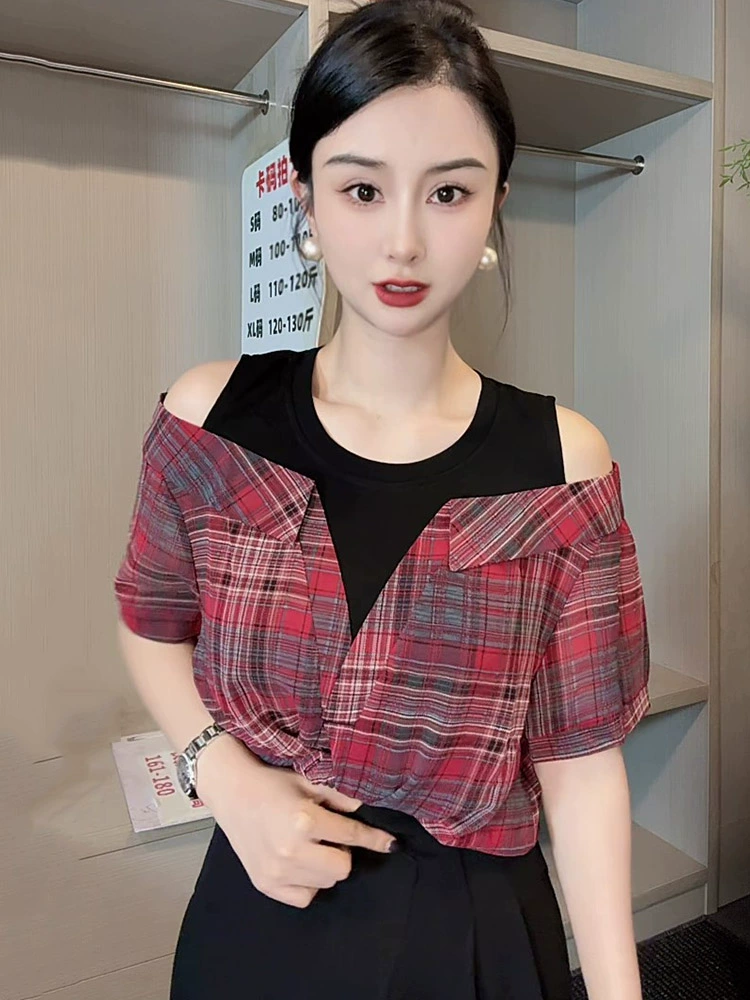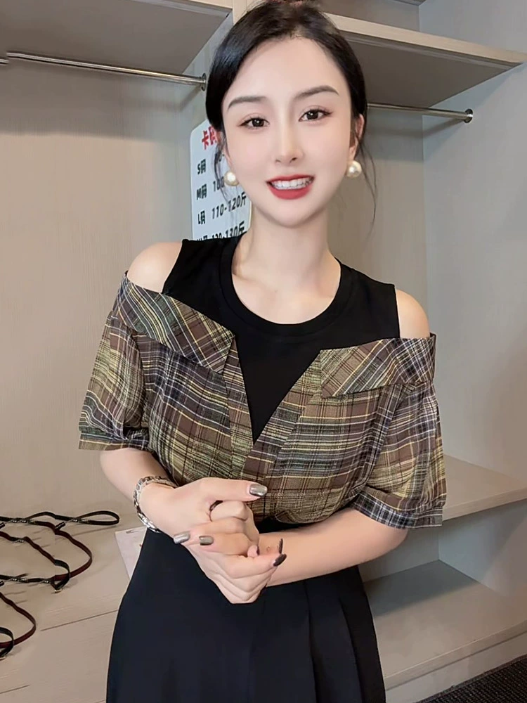| nameOriginal | Off-the-shoulder patchwork plaid short-sleeves, chic and fake two-piece |