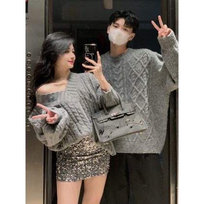 تسليم قطعة واحدة 2023 ملابس الزوجين لخريف وشتاء تصميم متخصص جديد عصري بياقة كسول سترة صوفية فضفاضة