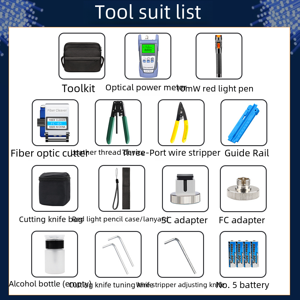 | nameOriginal | Optical fiber tool kit package fusion splicer cold Splice Kit toolbox Miller pliers optical power meter red light pen cutter |