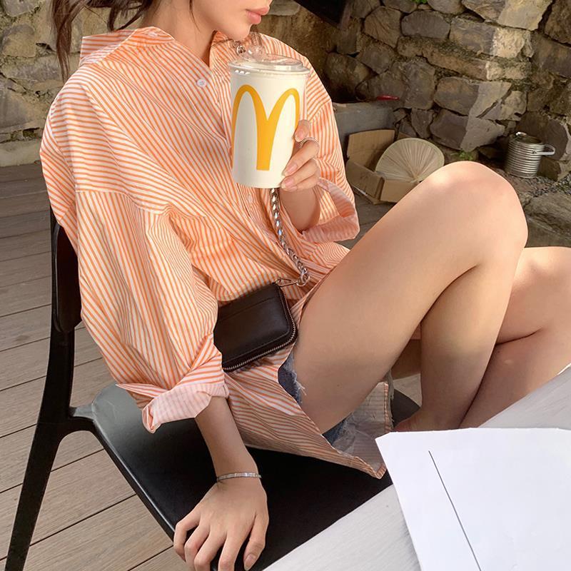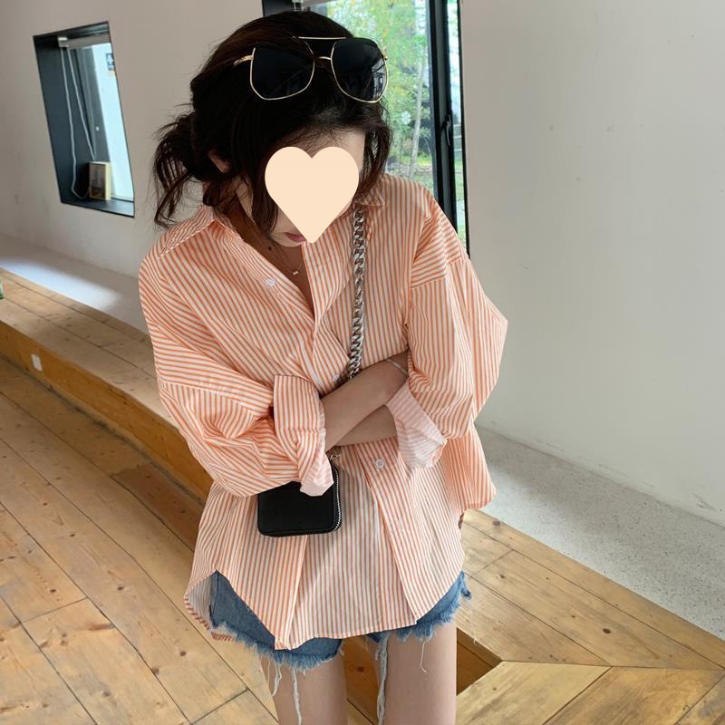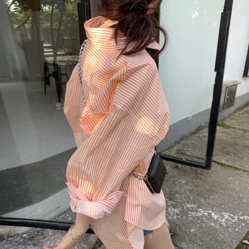 | nameOriginal | Orange vertical striped shirt Women's retro Hong Kong style autumn new design sense niche loose long sleeve top coat |