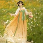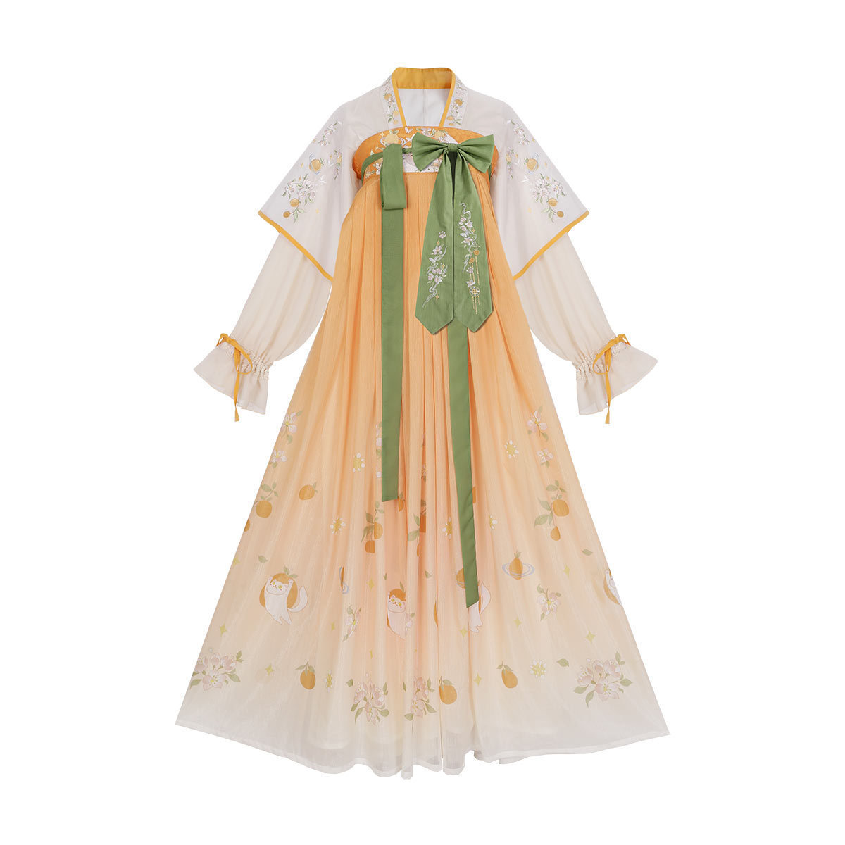 التصميم الأصلي نمط جديد صغير برتقالي Hanfu المرأة النمط الصيني تانغ نمط فستان الصدر مجموعة كاملة الربيع والصيف 6457